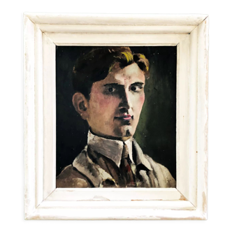 Antique 20th-century painting, oil on cardboard, three-quarter length portrait of a man with blue eyes in a dark suit against a burgundy-red background. The painting is a little darker in real life than in the photo. We have tried to reproduce the colors as best as possible, but variations persist. Dimensions: 37 X 45.8 cm. Good condition, signs of age, moisture stains. Carefully shipped.