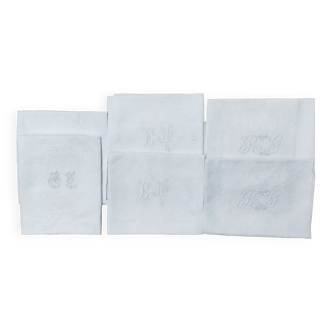 White rectangular tablecloth (153cm X 228cm)in damask cotton embroidered hand double monogram gr (in a diamond of 10cmx6cm on the tablecloth) 7 towels central embroidery gr dimensions 51cm X 58cm. Very good condition no stain or hole, damask rather thick stylized flower patterns and openwork triangles, well white, washed, fully sewn and embroidered by hand.