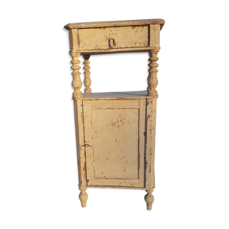 Vintage - Jam cupboard - Low sideboard - Country/Shabby chic - Solid wood. 1 door with 6 drawers. Beautiful patina finish: Light lime green front and sides against a gray background: lovely vintage effect. Niche and top in natural wood. Beautiful contrast with the light gray interior. Elegant style: Country & Shabby chic. Approximate overall dimensions: H115 cm x W74.9 cm x D40.1 cm. Niche under top: W61 cm x D32 cm x H22.6 cm. Interior drawer dimensions: Drawers 1-5: D29.5 cm x W27.5 cm x H7.5 cm. Bottom drawer: D29.5 cm x W27.5 cm x H12 cm. Second-hand furniture, refurbished and given a stylish makeover for a beautiful vintage look. The lock has been replaced with a handle. The interior drawers have been repainted and one drawer knob has been replaced. The interior shelf has been replaced and repainted. Heavy piece of furniture. The top shows signs of age. Request a quote before purchasing.