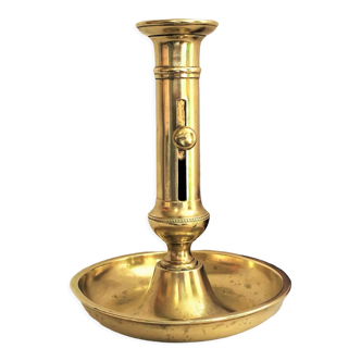 Pusher candle holder on solid brass frame. In perfect condition, beautiful patina. Height: 19cm. Coil diameter: 4.5cm. For candle of 2.5cm in diameter. Frame diameter: 14.5cm. Frame height: 1.5cm. 458g.