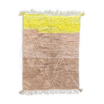 This contemporary Beni Ouarain rug features a refined minimalist composition combining soft ivory tones and warm caramel brown geometric shapes. Its bold yet balanced design creates a sculptural presence inspired by modern architecture while remaining rooted in traditional Moroccan weaving. Handwoven in Morocco from premium natural wool, this rug offers a dense, thick pile with exceptional softness and depth. Its tactile richness and clean composition make it a sophisticated element that stands out in modern interiors. Ideal for living rooms, bedrooms, or contemporary architectural spaces. Its neutral palette and graphic contrast harmonise beautifully with high-end minimalist, modern, Scandinavian, and bohemian interiors, adding warmth without overwhelming the eye. Handwoven from 100% natural wool using traditional Beni Ouarain weaving techniques. The thick pile provides exceptional comfort underfoot and excellent insulation, making it both luxurious and functional. In excellent condition. Unused and prepared by professionals before sale.