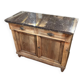 Sideboard in very solid wood to the test of time, tray painted in glossy satin navy blue with the bottom at the level of the feet and edge for a reminder, the rest in natural wood left in its juice. Spacious furniture for indoor storage. Consisting of 3 storage drawers and a shelf inside. Very functional and in very good condition. Some very small paint-level splinters on the set, due to wear, but which make its charm and authenticity. Brings a touch of countryside for a kitchen or a living room. Height 99cm / Length-width 97cm (with top above) and 94.5 (without the top) / Depth 54cm (with tray) and 49.5cm (without the top).