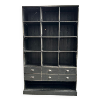 Wooden spice rack cabinet with 3 drawers, 3 compartments and 6 hooks. Can be fixed to the wall using two notches located at the back of the cabinet. Height: 80cm. Width: 52.5cm. Depth: 19.5cm.