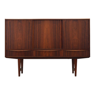 A unique sideboard made of teak wood produced in the danish manufactory bernhard pedersen & sønin the 1960s a piece of furniture with a sublime form and high-quality woodwork characteristic of danish design. The chest of drawers has a pair of roller shutter doors, shelves and 4 drawers inside. Everything after a comprehensive carpentry renovation. The furniture has been cleaned of the old coating and finished with danish oil.