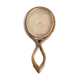 Very pretty tennis racket-shaped rattan mirror. Antique and very vintage model. Rare and uncommon model. Very high quality of workmanship. Hook on the back to fix it to the wall. Dimensions: Length 59 cm. Width 27 cm. Thickness 3 cm. Mirror diameter 17 cm. Carefully packaged for shipping. Many other rattan mirrors are available for sale.
