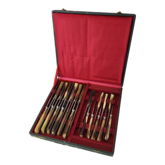 12 knives in their original case dating from the 40s, bakelite handles and stainless blades. Length 23cm. I also have the smaller knives for cheese.