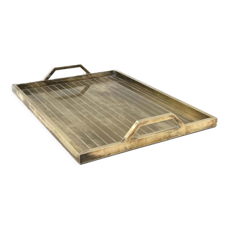 Élégant plateau de service Space Age produit en Europe dans les années 1970. Ce plateau rectangulaire se distingue par son plateau en verre laissant apparaître, en dessous, une décoration graphique moderniste composée de formes géométriques dans des tons de gris, noir et blanc, structurées autour d’une bande centrale à rayures parallèles. L’ensemble reflète parfaitement l’esthétique graphique et expérimentale des années 70, une période durant laquelle les objets du quotidien devenaient de véritables éléments décoratifs. La structure périphérique en métal apporte solidité et équilibre, tandis que les poignées latérales en bois laqué rouge ajoutent une touche de couleur vive et un contraste élégant, tout en assurant une prise en main confortable. Le dessous conserve son panneau d’origine en fibre de bois pressée, caractéristique des productions de l’époque. Le plateau est en bon état vintage, avec des traces normales du temps ainsi que de légères ondulations de la décoration sous le verre, visibles et cohérentes avec l’âge et les matériaux de l’objet. Un plateau à la fois fonctionnel et décoratif, idéal sur une table, un buffet ou dans une cuisine, et parfait pour apporter une touche Space Age et moderniste à un intérieur contemporain ou vintage.