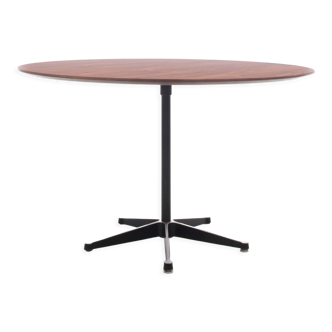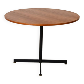 Very elegant round table, in the style of I. Gardella or O. Borsani. Italian production, made in the 1950s. Tabletop in varnished teak, bevelled on the edge, Black lacquered metal base with adjustable brass feet. Diameter 115cm, height 76cm (adjustable). With some normal signs of use for its age. But in very beautiful vintage condition.