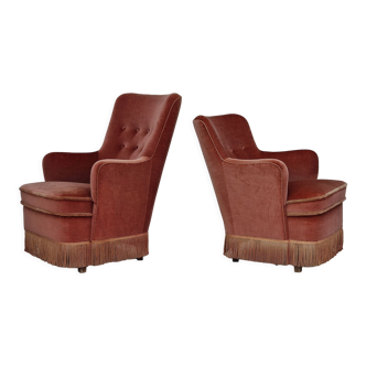 Set of 2 vintage cocktail armchairs / individual armchairs with fringes. 2 small retro armchairs in red-pink, price for the set. Dimensions: 75 X 70 X 89h cm. In good vintage condition – ready for a second life in a retro or eclectic interior. To be collected in Houthalen-Helchteren (Belgium). Shipping possible for an additional fee, depending on the distance.
