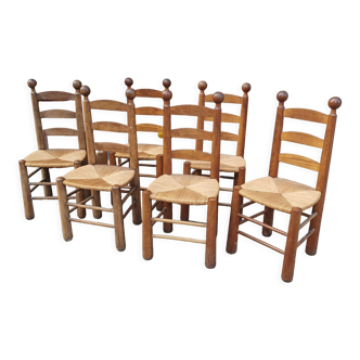 Magnificent set of 6 straw chairs with their very elegant high backs, quality craftsmanship from the early 1900s. Stable and robust, truly of very good manufacture, made entirely of solid oak. Beautiful patina of time, in good condition with signs of use related to age, see photos. A few snags on the straw but not bothersome. From a bourgeois house in Burgundy. Back height 1.17m, seat height 45cm, seat depth 41cm, seat length 44.5cm.