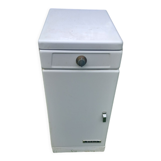 Metal furniture from the 50s. The sides and back have been sanded and then waxed in anthracite gray special metal. The interior, too damaged, has been veneered in 3mm MDF then painted in suede blue and upholstered just like the small drawer. The enameled parts have been cleaned and preserved. They still bear the traces of the past and its multiple uses. The door is slightly warped.
