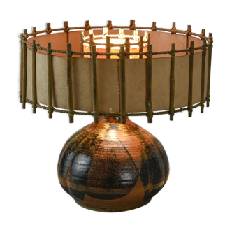 Very pretty bamboo lamp from the 60s attributed to the famous designer Louis Sognot (1892-1970) This lamp will give a vintage touch to your decoration and will go very well with the natural colors and materials of a bohemian-chic interior, It has been tested and works perfectly with a standard bayonet bulb type b22 (not included). We note that the paper has been replaced. {lampshade diameter: 14cm - height: 35cm - diameter at the base: 14cm}.
