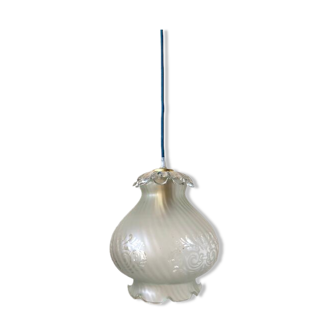 Twisted vintage opaline suspension. Height 31cm. Globe diameter 22cm. Diameter opening 9.5cm.
