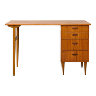 Small desk in oak and oak veneer - completely sanded then waxed colorless matt - 1 drawer under the top and 3 drawers on the right side (some ink stains on the inside bottom) with black iron and brass handles - 'grasshopper' feet - top with traces (see photo) - width 80 cm - height 72 cm - depth 44 cm - drawer under the top: width 36.5 cm - height 7.5 cm - depth 30 cm - right drawers: width 23 cm - height 10 cm - depth 33 cm - under-top: width 42 cm - height 59 cm -.
