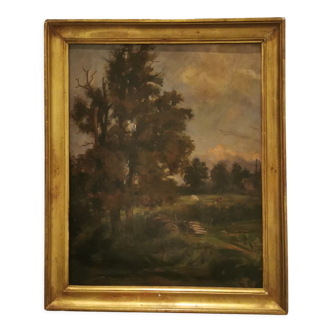 Signed canvas painting with village decor. Molded gilded wood frame. Frame 35 x 30cm. Thickness 4.5cm. Canvas 13 x 18cm.