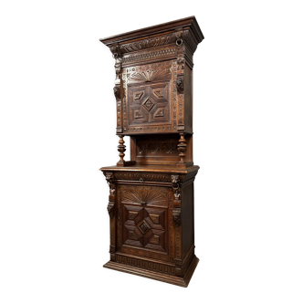 Old carved solid wood dresser. Good condition. Normal traces of time. Furniture in 2 parts. Assembly by wooden dowel. With key. Height 226 cm. Width of lower part 76cm, depth 50 cm. Width of upper part 72 cm. Depth 36 cm.