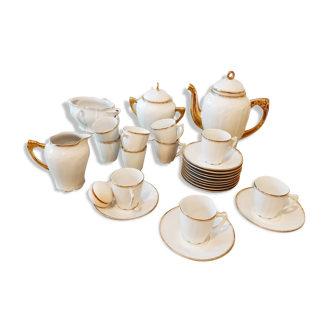 Coffee service for 6 people from the 60s in fine earthenware (half porcelain) stamped kg lunéville, bordered by a tender almond green color and circled with gold. It is in good condition, close to new, with traces of use on the back of the cups only or some slight manufacturing defects. It consists of 16 pieces: 6 cups (d9.5 h5), 6 under cups (d14.5), 1 sugar bowl (d10 h10), 1 milk jar (d8 h9), 1 coffee maker (d13 h 18), 1 cake plate (d22.5).