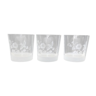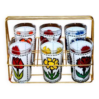 Set of 6 glasses decorated with butterflies featuring naturalistic patterns, each illustrated with a different species and its scientific name. Very beautiful vintage aesthetic, both playful and decorative, perfect for an original table or a collection. The colours are vibrant and well-preserved, with a style typical of productions from the 60s–70s. Each glass has a different design, which enhances the charm of the set. Dimensions: Height 8.5 cm. Diameter 6.5 cm. Very good overall condition.