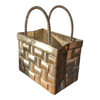 Exceptional, rare 1980s brass magazine rack in Hollywood Regency style. Made entirely of brass: woven from brass strips, some parts are chrome-plated. Stunning, elegant design. Black wood interior. In very good vintage condition with minimal signs of wear and a light patina. Probably of an Italian manufacture. 100% original. All parts complete. Suitable for any living space and highly decorative. Total height with handle: 33 cm|13, 0" Height without handle: 29.5 cm|11, 6" Width: 36.5 cm|14, 4" Depth: 14.5 cm|5, 7" Will be packed very well for safe shipping.