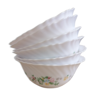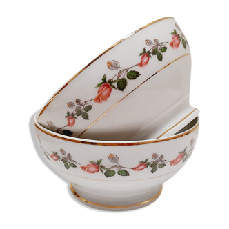 Beautiful set of 3 white ceramic bowls with a vintage rose design in colour and gold, a charming ensemble for breakfast, your table decor, and aperitifs... we are under the spell! 1 set with nearly identical sizes, beautifully stackable, where each one enhances the others, a trio full of poetry. In very good condition, even impeccable. The bowl with golden flowers is whiter than the other two, which have a very light cream tone. Price for the set. Total weight: 770g. Uni: Diameter: 12.5cm - Height: 7cm Rose: Diameter: 13cm - Height: 7cm Gold: Diameter: 13cm - Height: 7cm The little extra: FREE pick-up available in Paris Bastille, France, or careful shipping by parcel.