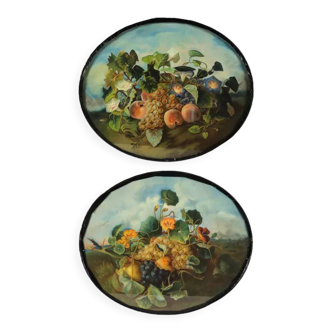 Black painted wooden tray with handles on each side. Still life decoration bowl with lemons and foliage. Oval shape. Used, very good condition. Dimensions: 47 X 32 X 4cm.