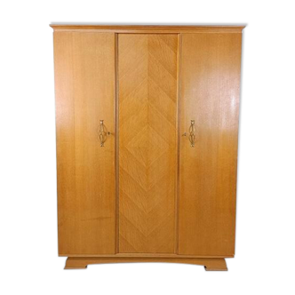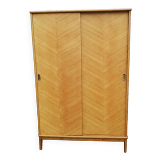 Very nice parisian wardrobe from the 50s. Impeccable condition: it has not seen the years pass! Its sliding doors work perfectly and offer a certain saving of space. The wooden structure is solid, stable and so much prettier than what the swedish brand offers... Inside, a shelf and a wardrobe bar over the entire width. Nice details: compass feet, bakelite handles, rounded corners, chevron veneer of door panels, beautiful color of wood. The plus: with an ultra simple fastening system, it can be dismantled and reassembled without tools with only 10 bolts to tighten in 10 minutes! It can therefore easily wander around in a car trunk or elevator. Ideal for an apartment in the city or to take it to your second home! Dimensions h189 X w141 X p61.