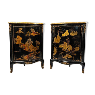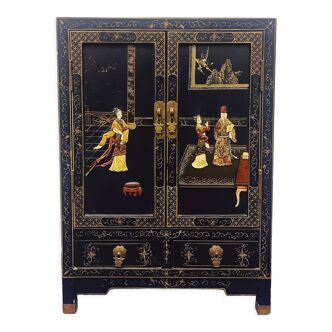 Chinese buffet with 3 doors and 3 drawers in Chinese lacquer. The structure of the furniture is primarily made of acacia wood. Once the Chinese furniture is assembled, the finishing process begins to achieve perfect surfaces. The wood is levelled with a natural coating, then sanded and polished. The furniture is then coated with three layers of lacquer. It is time for the artists to begin painting the desired design (flowers, birds, or figures). Once the decorations are completed, a hand-applied finishing lacquer will protect the furniture and give it a permanent shine. The decoration features figures in mother-of-pearl set in a natural Asian environment. The decorations are hand-painted. The drawers of this Asian furniture are lined with felt. The Chinese fittings are made of brass. The furniture is delivered with a protective glass. Origin: China.
