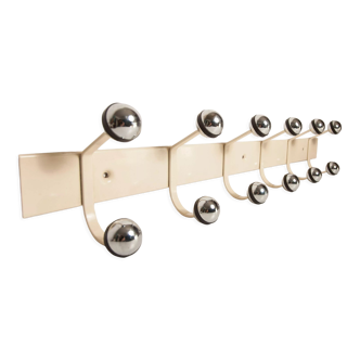 Wall coat door with four large wooden balls painted off-white; patina, peeling paint, two brass legs at the back to hang it. It was czechoslovakia of the 1960s that saw the emergence of this object full of verve and fantasy.