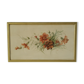 Painting on silk under glass, beautiful frame. Bouquet of flowers with dragonfly. Signed Gaby Jouvet. Dimensions: 46.5cmx55cm.