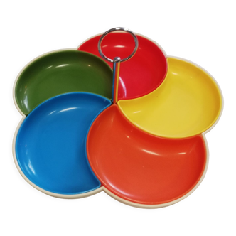 Servant for the aperitif of the 70s. Five cups of orange, yellow, blue, red and green color placed on a tray of white color. Material: plastic and chrome metal for the handle. Good condition of use but it is not new. Traces of use and 1 small lack on the orange cup. (visible in photos) Dimensions: height 14cm and diameter 28.5cm. Weight 360g.