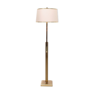Vintage floor lamp art deco spirit. Golden brass and alabaster foot. Lampshade fabrics. Total height: 174 cm. Base diameter: 30 cm. Lampshade (h/diam): 27/40 cm. Bulb e27 (floor lamp completely recalibrated and socket changed. Period foot switch) This article is old, it presents some traces of the past time.