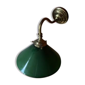 To be fixed to the wall above a sink in a kitchen or above a mirror in a bathroom. An antique wall light with a golden brass arm, a porcelain base, and a delicate white opaline shade with a diameter of 19cm. Bayonet bulb socket. Careful shipping.
