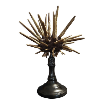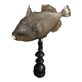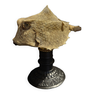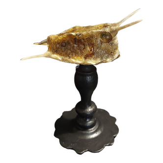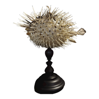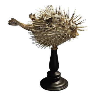 Real vintage taxidermy diodon with brown/beige two-tone scales placed on a wooden base. Also called sunfish, hedgehogfish or long-spined porcupine, it is known to be able to inflate very quickly to frighten its attackers by accumulating air or water in its esophagus. This diodon has been naturalized by a professional taxidermist with great care and taste. He has a soft look; very far from some badly stuffed animals that are scary! A rare piece, which will delight lovers of these aquatic animals, and will bring a nice retro touch to your interior! It is also a nice gift for lovers of nature and cabinets of curiosities. Lo 37 X h 21 X la 25 cm. Bc 2023-041.