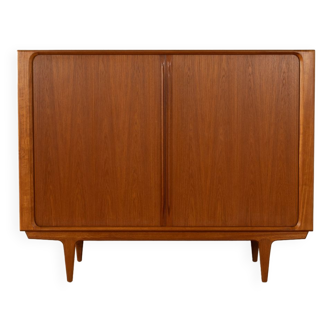 Classic bar cabinet from the 1960s by dyrlund. High-quality corpus in teak veneer with four sliding doors, one inner drawer, an extractable shelf, a shelf and original plastic castors. The interior can be illuminated. Quality features: very good workmanship. high-quality materials. solid wood drawer. corpus with solid wood edges. made in denmark, manufacturer: dyrlund (branding on corpus).