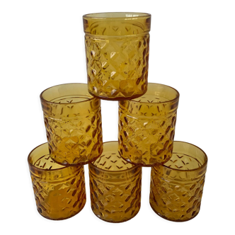 Set of 7 antique amber glass water glasses "Pernod S.A." in very good condition. 2 additional glasses included with small chips on the rim. Height 9.5 cm. Diameter 6.5 cm. Total weight 2 kg. Careful shipping.
