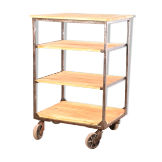 Vintage workshop maid 1950 on wheels in hammered gray metal.2 swivel drawers and fixed shelves. Good condition.(recent painting) To divert for bathroom... Barber shop... Tattooist... Artist... Restaurant... Space between the shelves 27 cms for 2 and 21. . Ready for a new life.