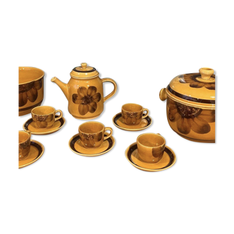 Complete coffee and tea service in Fine Earthenware "Keller et Guérin Luneville / St Clément" Collection "Red Poppy" typical of the 1950s/1970s. This collection differs from the classic collection (Fin Lantern) that made the Lunéville factory world-renowned (though the "floral" motif is still present) The typology of the cursive signature "Lunéville France" or "Lunéville handmade France" indicates dating from the 1970s. The service consists of: 6 coffee cups and 6 saucers: Cup height: 6.5cm. Cup diameter: 8cm. Saucer diameter: 15cm. 338g X 6 = 2028g. 2 very large tea/chocolate cups and 2 saucers. Cup height: 9cm. Cup diameters: 12.4cm. Saucer diameters: 18.7cm. 621g X 2 = 1242g. 1 teapot. Height: 13.7cm (without the lid) Length: 23cm (from spout to handle) Neck diameter: 9.5cm. 805g. 1 sugar bowl. Height: 8cm. Neck diameter: 8.9cm. 400g. 1 mug. Height: 9cm. Diameter: 8cm. 283g. The service is in very, very good condition, just a few light signs of wear due to half a century of existence! Carefully packaged for shipping! (Rest assured about the delivery) Founded in 1730, the Lunéville factory is one of the most famous manufacturers of earthenware production in the 18th and 19th centuries. In 1892, the faience factories of Keller and Gerin and Saint Clément merged and then dominated the French market. Its reputation is worldwide!.