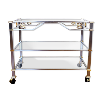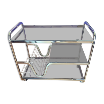The structure of this coffee table is made of chromed metal topped with a smoked glass top. Its shape is rather rectangular but with very rounded corners. The structure is composed of three steel ribbons joined by spacers also chrome. This all-chrome base makes it a very present piece of furniture, typical of the 70s. The chrome and glass top are in perfect condition.