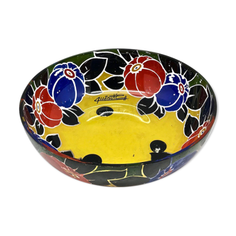 Small salad bowl style "provençal" accompanied by its 6 cups. Perfect for an aperitif. Two very slight chips on the edge of the bowl and a very slight crack without consequence. The 6 cups are in perfect condition (6 cm in diameter and 3.5 cm in height).