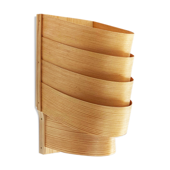 Wall light/sconce made from carefully bent sheets of pine wood connected to a wooden frame. Exceptionally nice grain in this one, stunning when lit. Warm transparent projection through the wood grains as well as a decorative light effect up and down the wall behind it. Unknown producer. These type of pine lamps were traditionally made by ellysett ab and hans-agne jakobsson or translandia in denmark but this one is constructed slightly differently so I am pretty sure that it is not from any of them. The veneer in this one has a few small breaks as seen in the last photos. The damage is well reflected in the price. Standard e 27 light bulb socket.