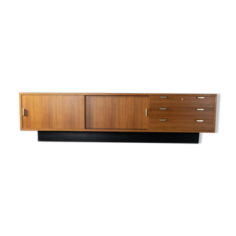 Classic sideboard from the 1960s. Corpus in walnut veneer with four drawers, two doors, one shelf and a black contrasting base. The top ss coated with resopal in black. Quality features: Very good workmanship. High-quality materials. Solid wood drawers. Made in germany.