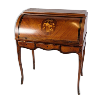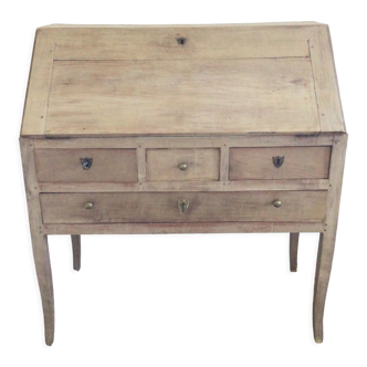 Antique secretary desk in patinated wood with elegant cabriole legs. The drop-front opens to reveal a work surface (original khaki writing surface) and several storage compartments, including a secret compartment in the center. One of the three drawers on the front is a decorative piece. Its size also makes it suitable as an entryway table. Original gilt handles and lock. Painted in a grey oyster mushroom color (Libéron). A few signs of age add to its charm. Dimensions: D41/W69/H90cm. Height under the drop-front: 66cm.