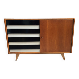 Buffet Jiri Jiroutek. Beech structure with a clear varnish. The drawers are black, white, and pink. Compass legs. One buffet section and 4 drawers. Drawer interiors are made of plastic. Very good condition.