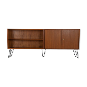 Double-sided cabinet - composed on one side: shelves and cupboard doors in trompe l'oeil with brass buttons and on the other side: shelves and panel - in exotic wood - black iron base (two traces on each external foot: see photo) - some traces of use and a slight halo on the tray (see photo) - Larg. 160 cm - high. 74.5 cm -prof. 40 cm - Shelf: larg. 74.5 cm - prof. 37 cm - / larg. 72.5 cm - prof. 37 cm -.