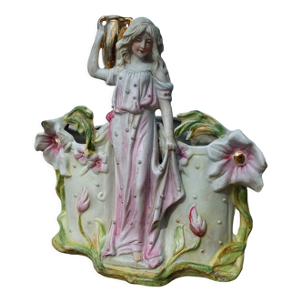 Ancient polychrome biscuit holy water font depicting an angel holding a shell. Length 16 cm. Width 9 cm. Chipped, missing at the edge of the shell.