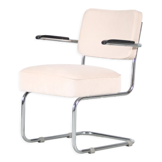 Vintage tripod stool. Seat covered in white skaï. Good condition. Tubular structure, chrome-plated steel, good condition. Seat height 49 cm, 61 high back included. 44 cm wide and 42 cm deep.