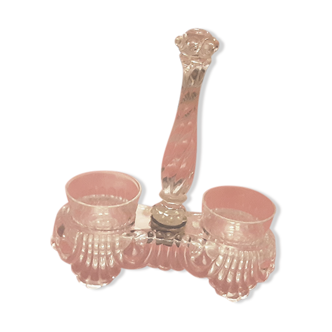 "pair of solid silver salters" Pair of double salerons - solid silver frame punched with the minerva and interiors in blue crystal. French work of the late nineteenth, early twentieth. Openwork decoration with a pattern of angels playing the flute (upper part) and garlands of flowers (lower part). Very good condition of the whole. Total weight of solid silver (two frames): 465 grams. Dimensions - Silver weight: 465 grams. Total length: 14.4 centimeters. Total width: 8 centimeters. Total height: 15 centimeters. Interior length: 7 centimeters. Interior width: 4.8 centimeters. Interior height: 3 centimeters. Gap between interiors: 4 centimeters. You can check out our other listings.