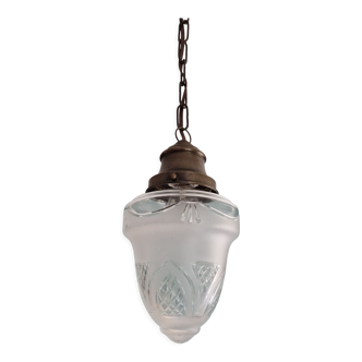 So-called empire-style balloon suspension chandelier in blown glass. The squall is made of faceted glass that gently diffuses light. Stylized brass frame. Height 47 cm. 18cm diameter.