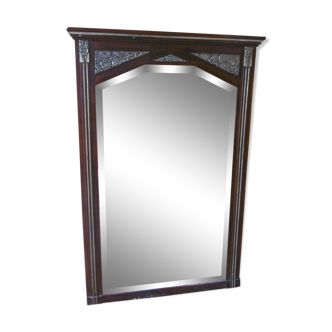 Old door of large wardrobe diverted in mirror to pose. Beveled mirror. Very trimmed with wood sizes. Heavy. This mirror can be placed upside down (compared to the photo) The lock has been clogged but leaves a minimal trace.