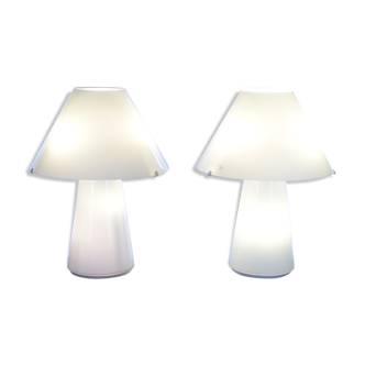 Table lamp, foot and lampshade all in opal glass color white. Two rooms available, perfect for bedside tables. • height 25 cm. • width lampshade 22 cm. • base ø 12 cm. • bulb e 27. • electric wire with black switch.